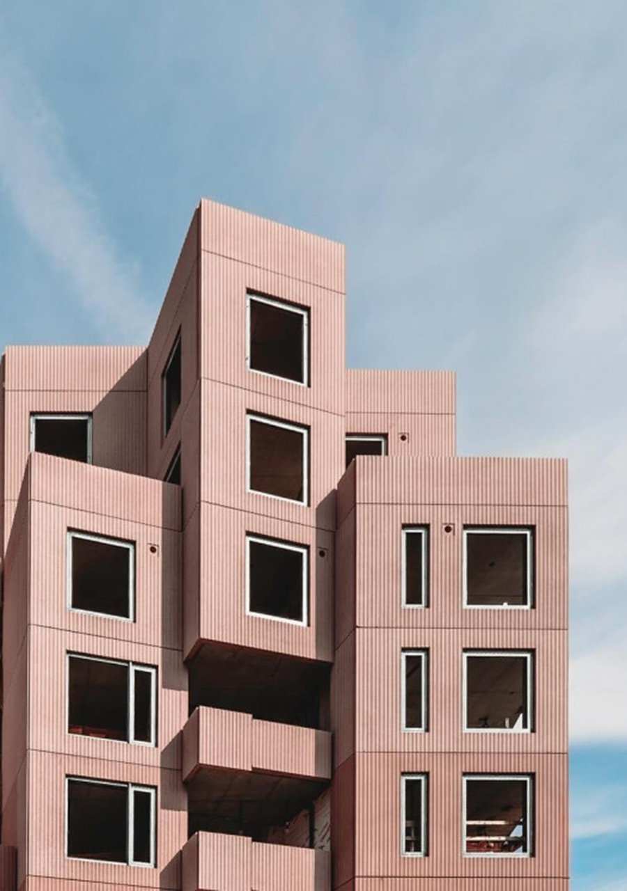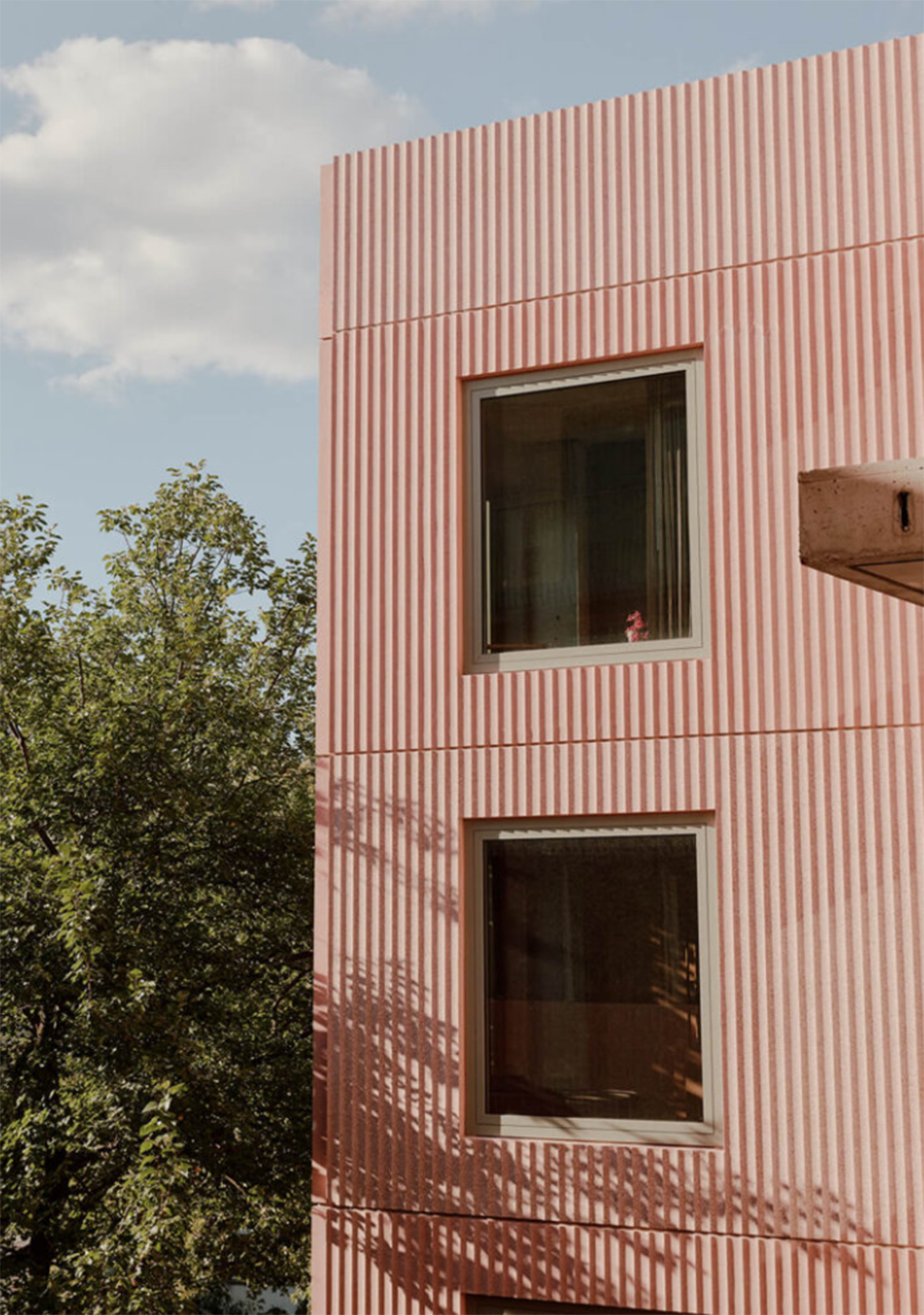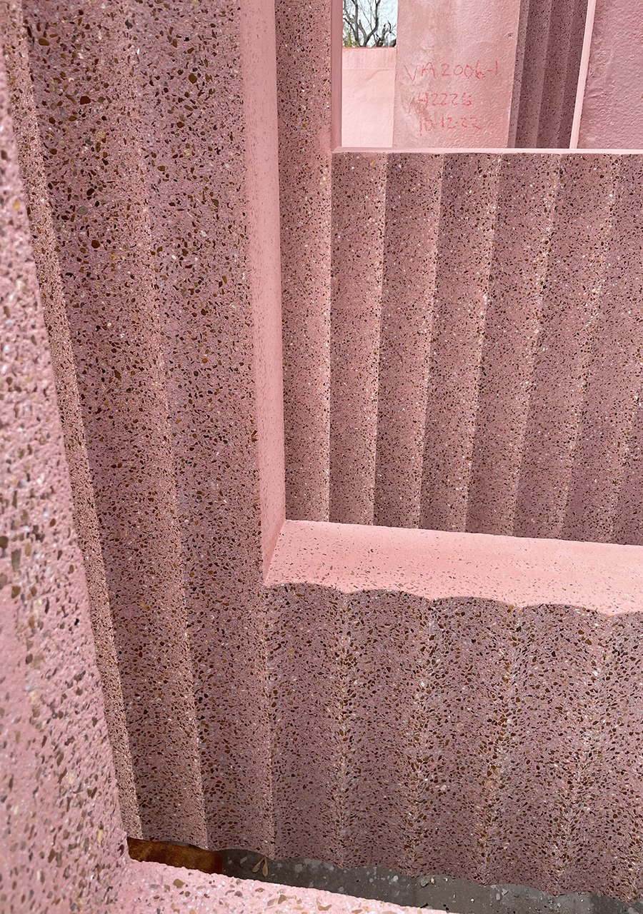 The pink precast concrete facade is shaped by a scalloped geometry that modulates light and shadow across the building throughout the day. This texture echoes the larger undulating folds of the building’s form, allowing the exterior surface and interior spaces to engage with the changing light and shadow through the day.