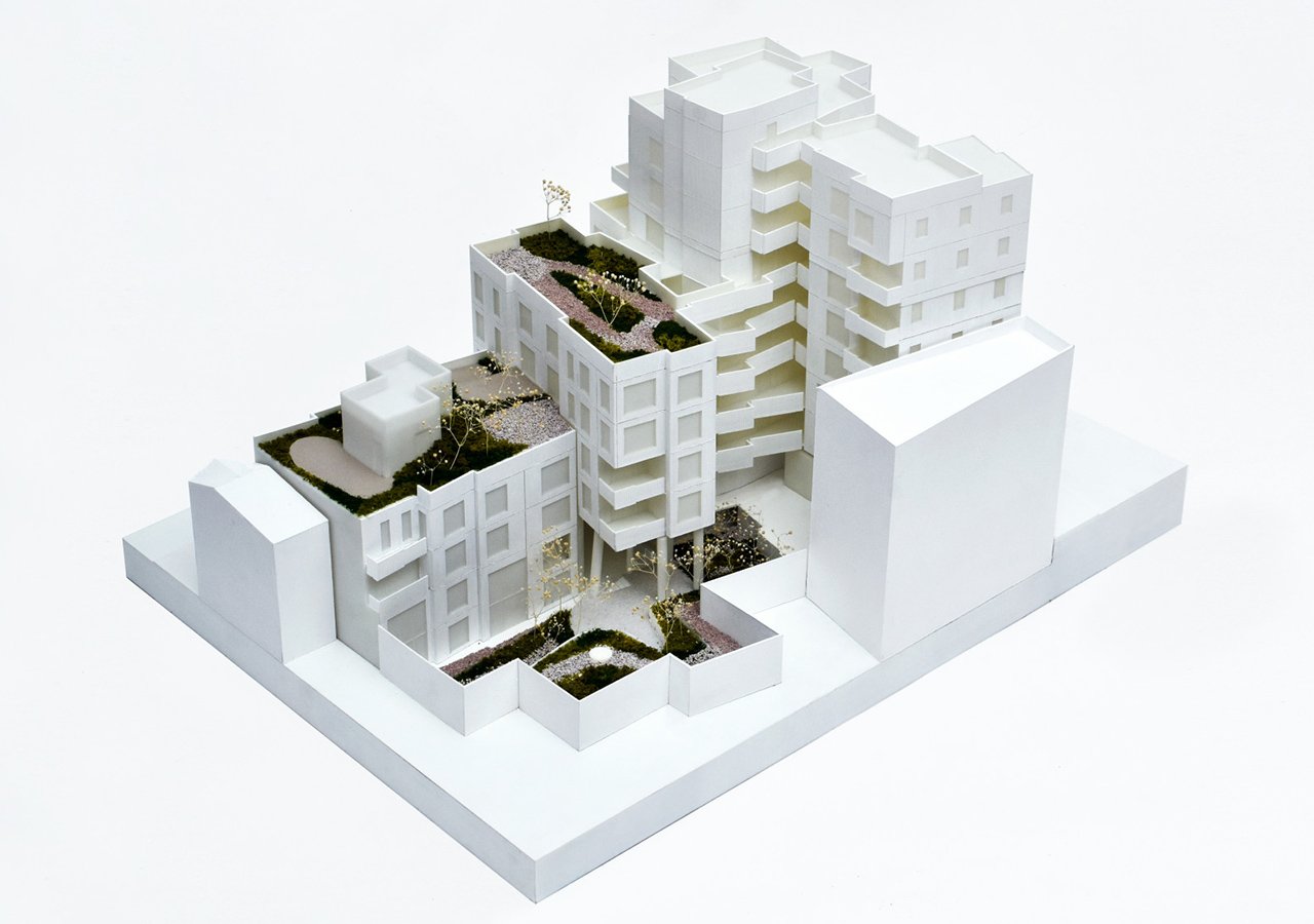 Open air walkways serve as shared circulation, establishing a gradual transition between public and private space. These paths connect to a series of outdoor environments including a landscaped rear garden, terraces, and roof decks that support both collective use and individual dwelling.