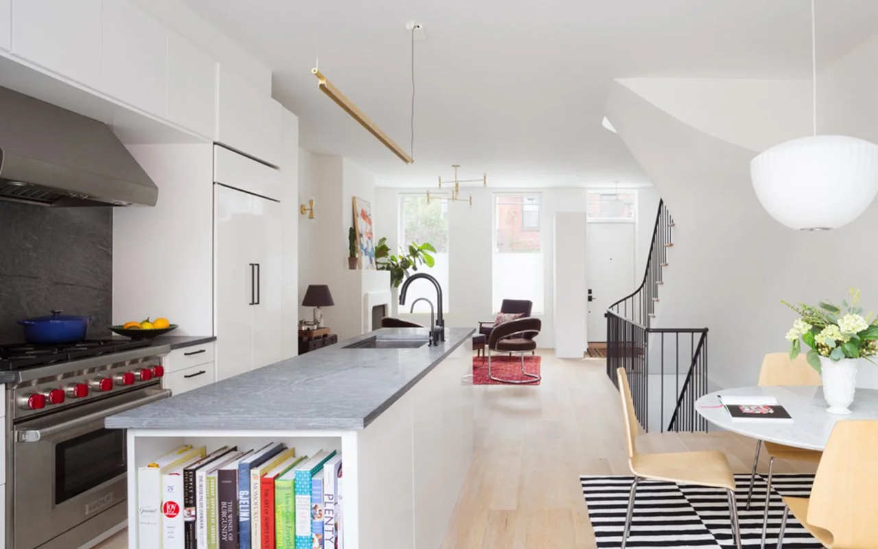 For our design the plans were completely reimagined with the ground floor opened up as a continuous living, dining, and kitchen space, allowing the space to flow seamlessly into the rear yard and maximize the sense of openness. A new central stair, topped with a large skylight, was introduced to draw daylight down through the center of the home, illuminating all three levels of the home including a newly finished cellar.