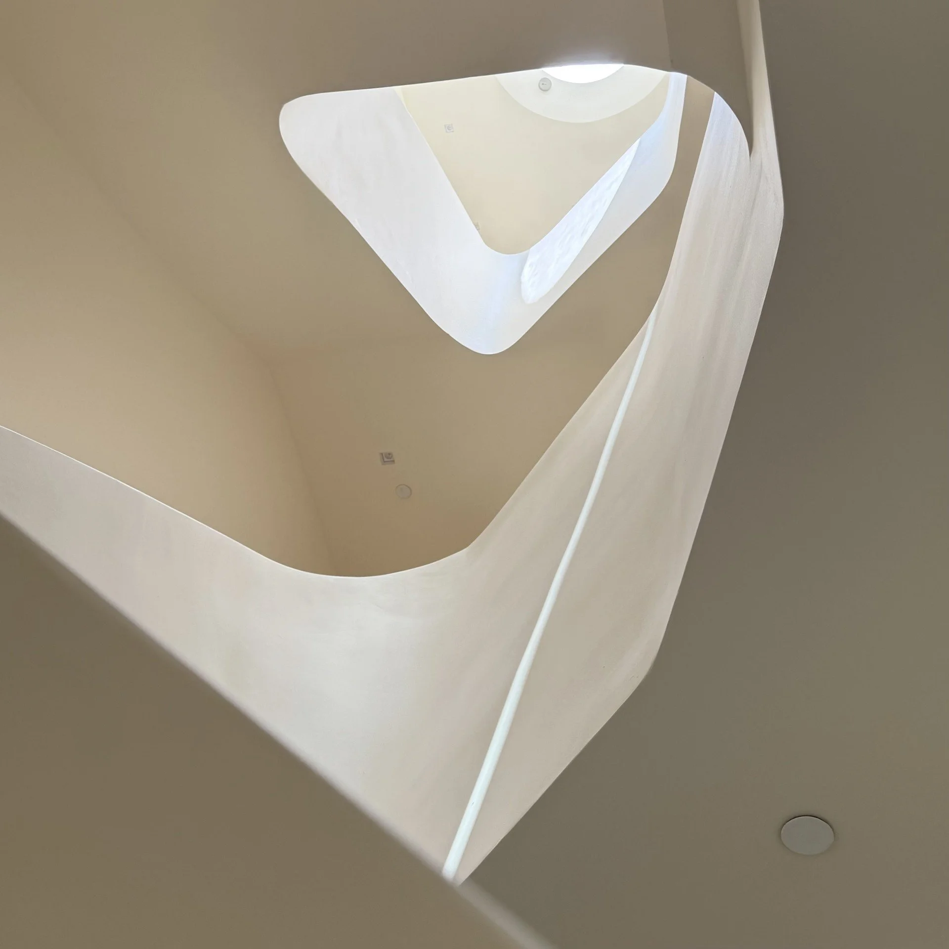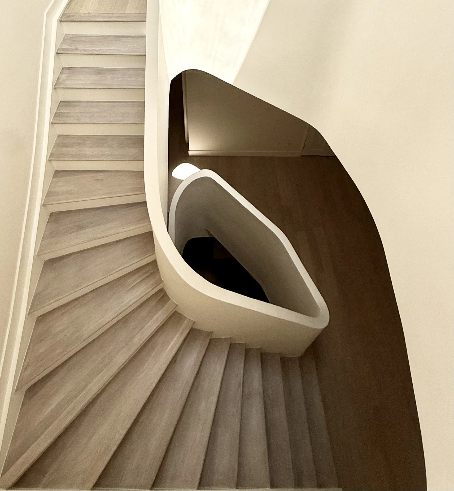 Together, these strategies create a more three dimensional interior, one that expands vertically and diagonally rather than relying solely on the frontal organization typical of the townhouse.