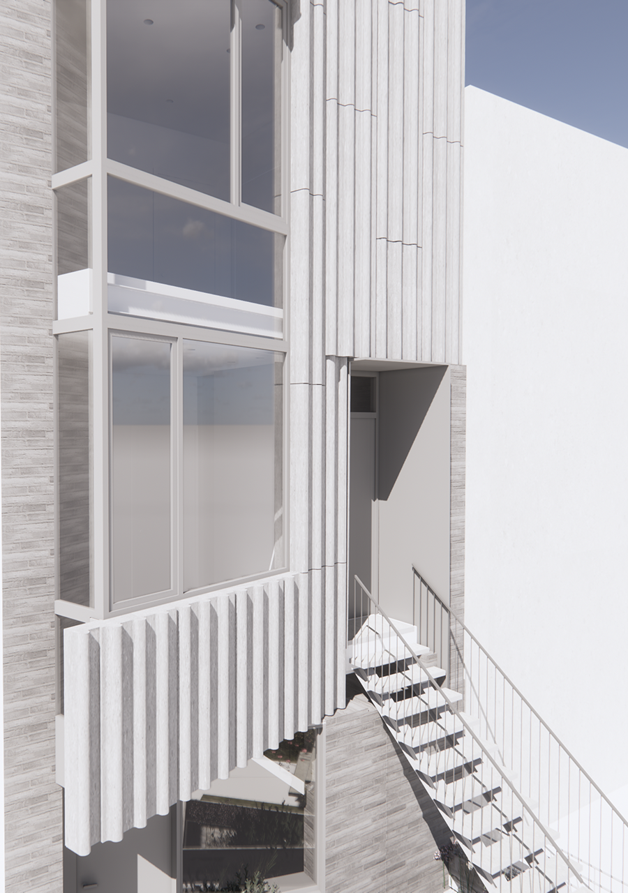 At the rear facade, large glass openings and a rear deck dissolve the boundary between interior and garden, drawing daylight deep into the plan and reinforcing a continuous relationship between inside and outside. At the center of the home, an interior light well introduces daylight into the central circulation stair, transforming what is often a dark, compressed zone into an active vertical space. A skylight above, paired with clerestory windows at the setback, allows light to cascade downward and shift throughout the day, registering time and movement within the home.