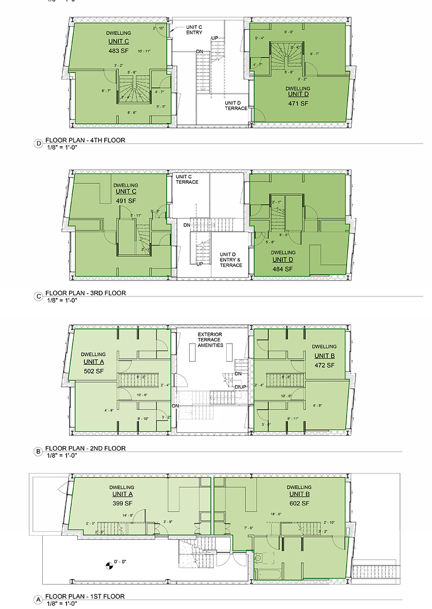 The residences are configured as duplex units, each with a dual orientation to the interior court and either the street or rear yard. This arrangement supports natural cross ventilation, generous daylighting, and a clear relationship between private living spaces and shared circulation. The court operates as both an outdoor room and a connective spine, blurring the boundary between circulation and inhabitable space.
