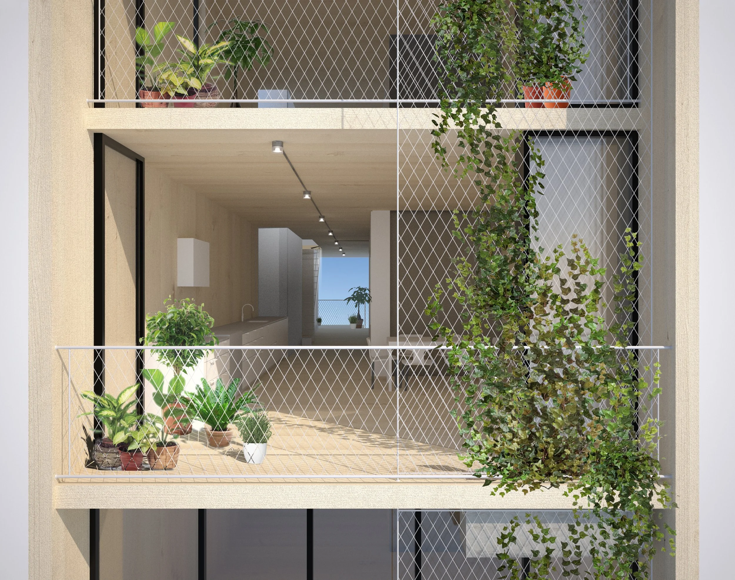 4. Landscape Gardens: Our design proposes the introduction of landscape into the units by integrating full length porches for every unit with integrated planters and growing trellis. These elements will provide solar shading and allow space planting opportunities at each unit.
